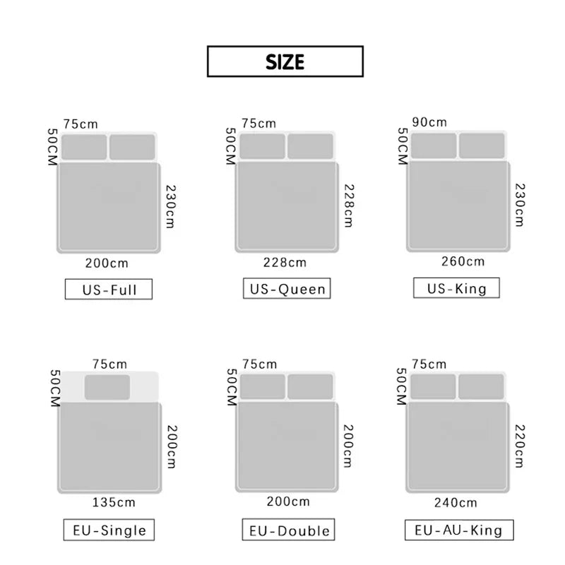 - Queen (3 pcs): 1 Duvet Cover (228Γ228 cm / 89.7Γ89.7 in), 2 Pillowcases (50Γ75 cm / 19.7Γ29.5 in)