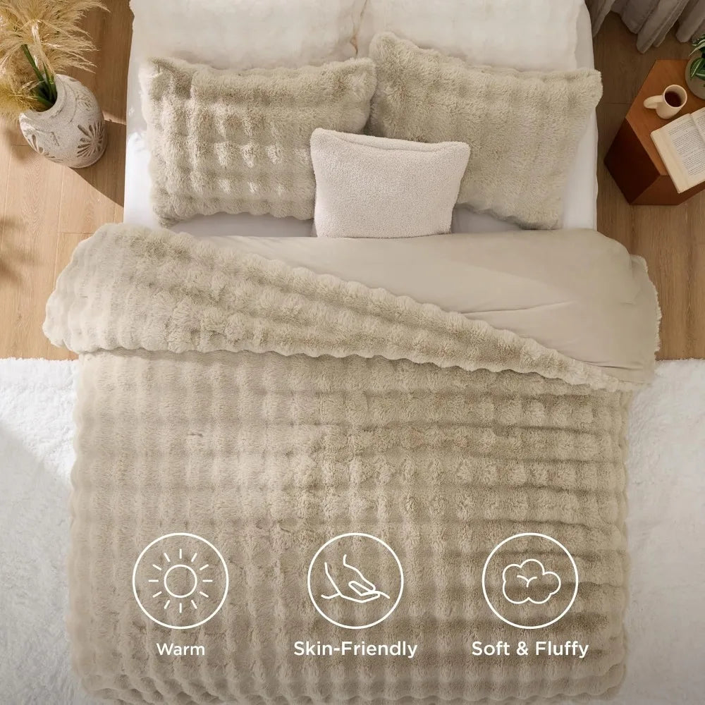 King Size Light Beige Faux Fur Fluffy Comforter Set β Plush Shaggy Bubble Bedding