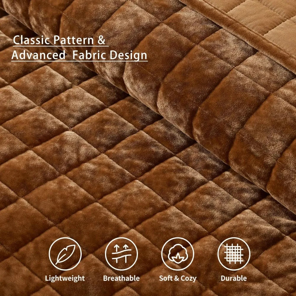 King Size Velvet Quilt Set – 98x106 in, Lightweight Caramel Comforter with 2 Pillow Shams