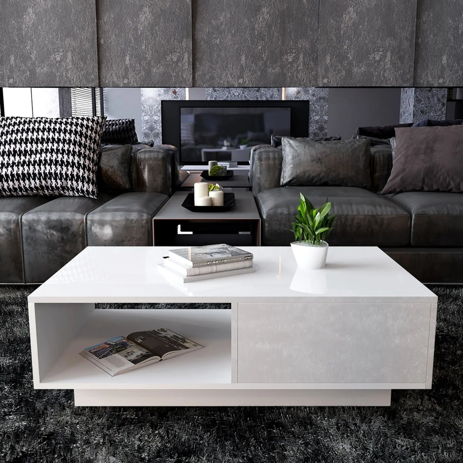 Bring sleek modern style to your living space with this high-gloss rectangular coffee table. Its minimalist design, smooth finish, and optional LED lighting make it the perfect centerpiece for any contemporary home.